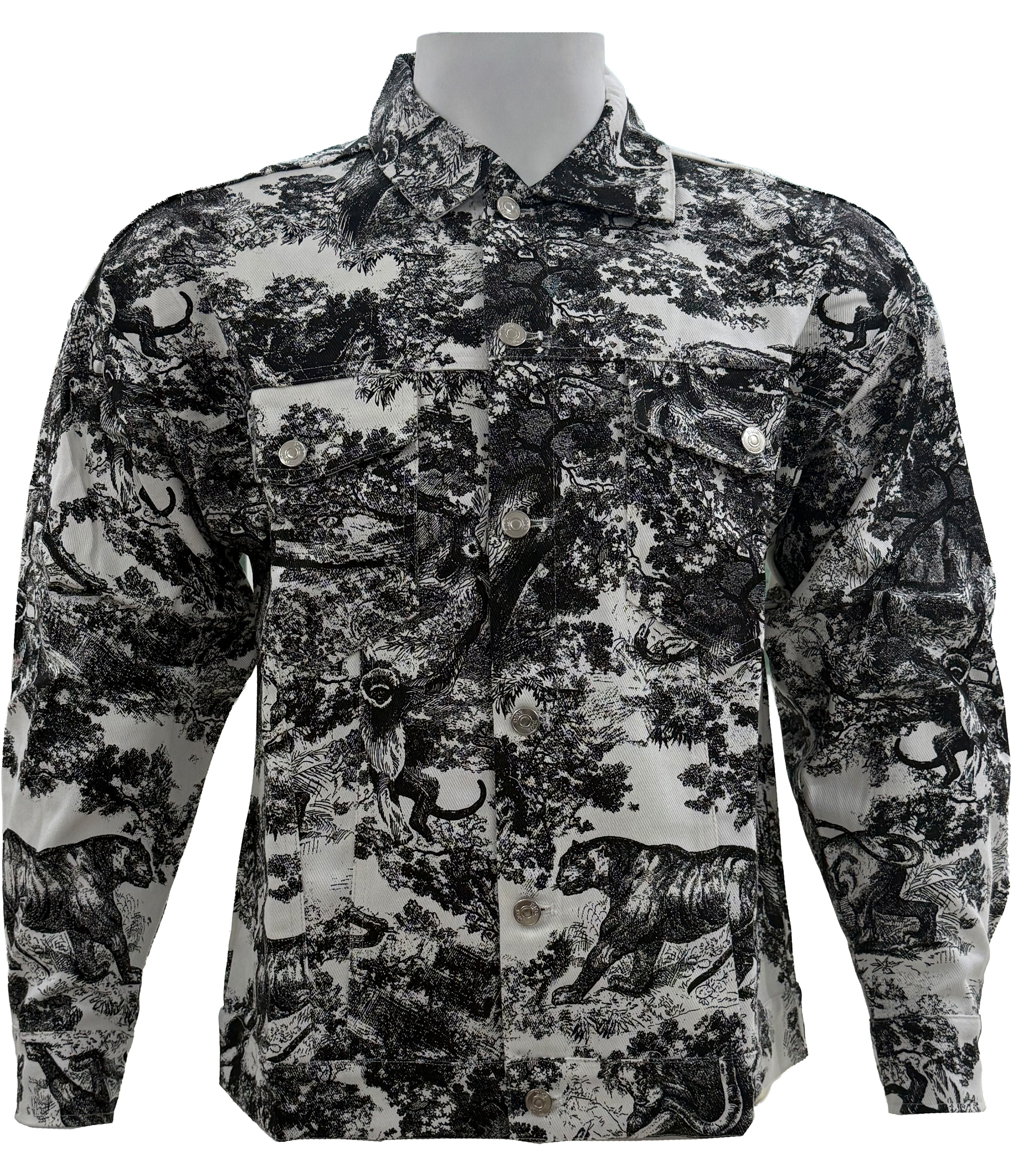Refined and visually striking, this Christian Dior dark grey & white denim jacket features the signature Toile de Jouy motif in a rich, high-contrast illustration. The darker grey base tone softens the look while keeping the iconic Dior artistic style, creating a sophisticated statement piece with clean tailoring and premium detailing. It features: