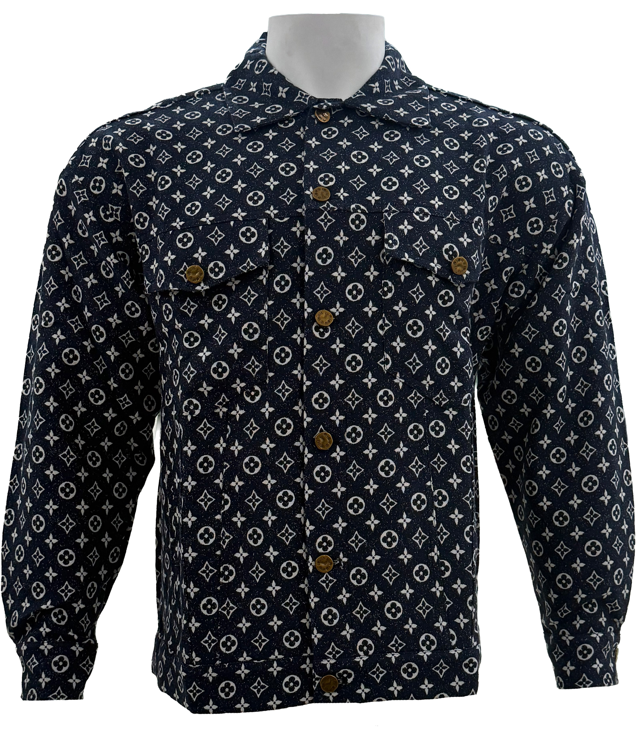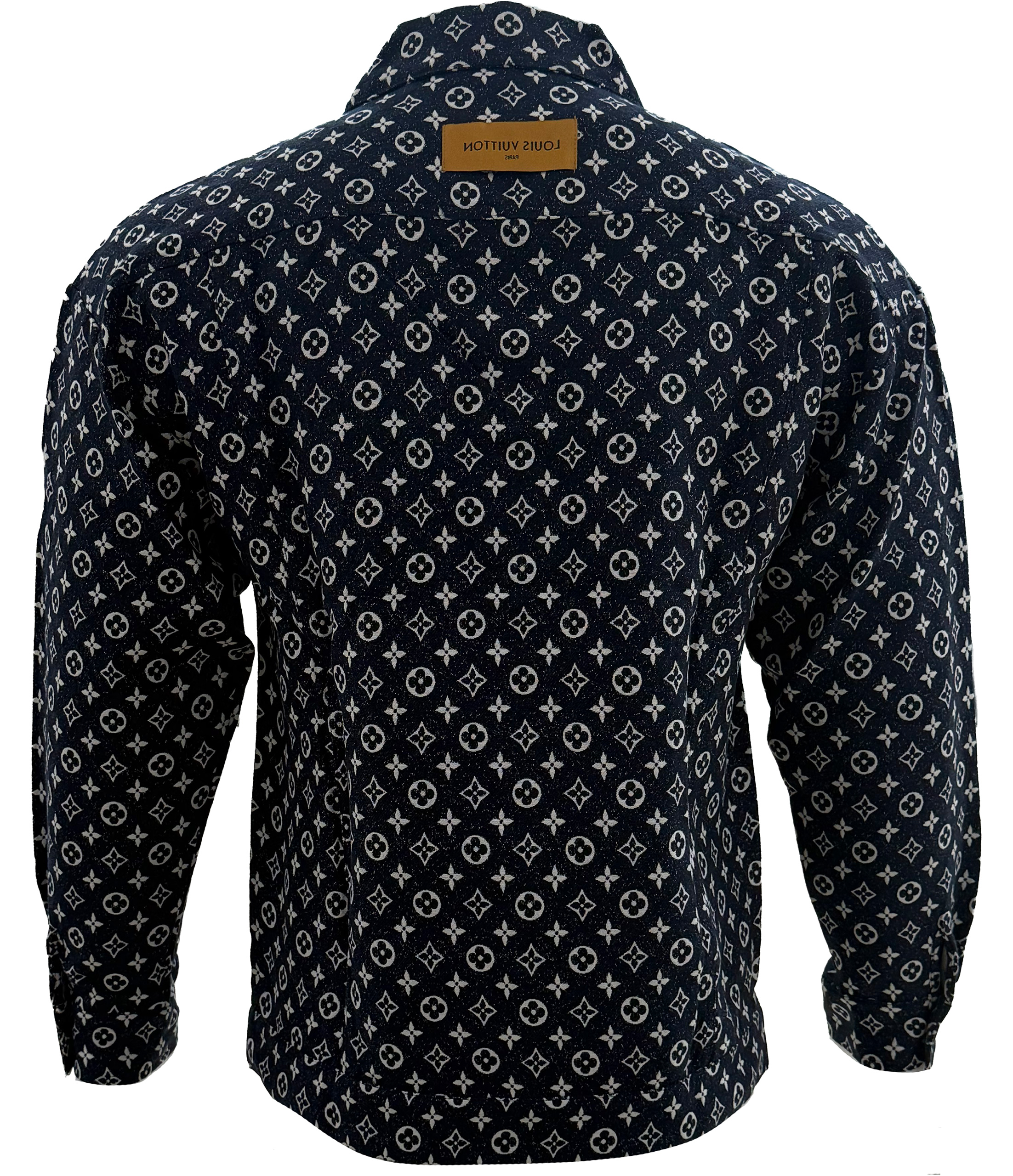 Sharp and visually distinctive, this Louis Vuitton dark navy blue monogram denim jacket features the iconic LV pattern printed in white across a deep navy-blue denim base. The richer blue tone sets it apart from classic black, giving the jacket a brighter, more contrasted designer look while keeping a structured and refined silhouette. It features: