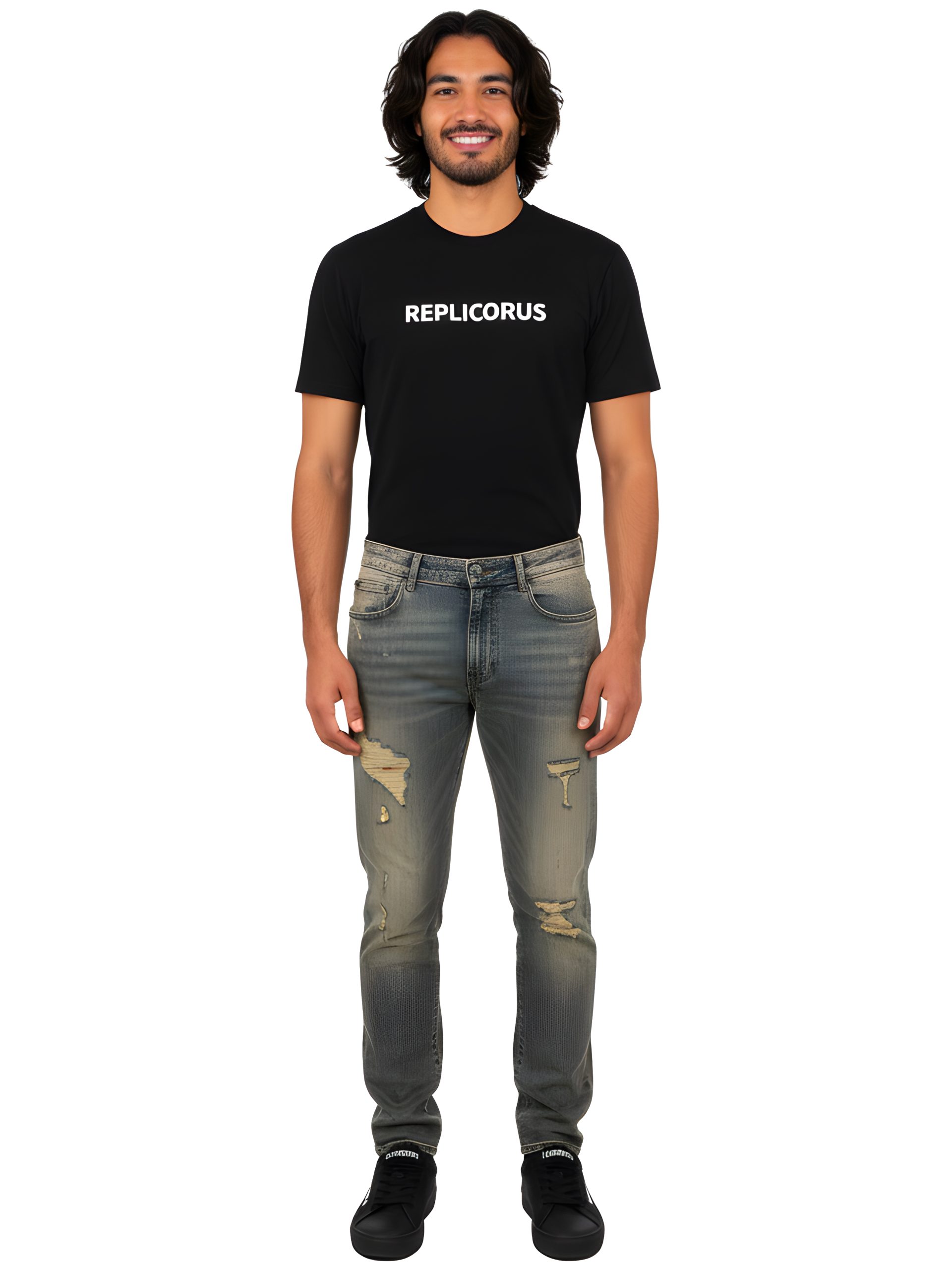 - Distressed detailing throughout the front and back, including frayed tears, abrasion marks, and hand-worn effects