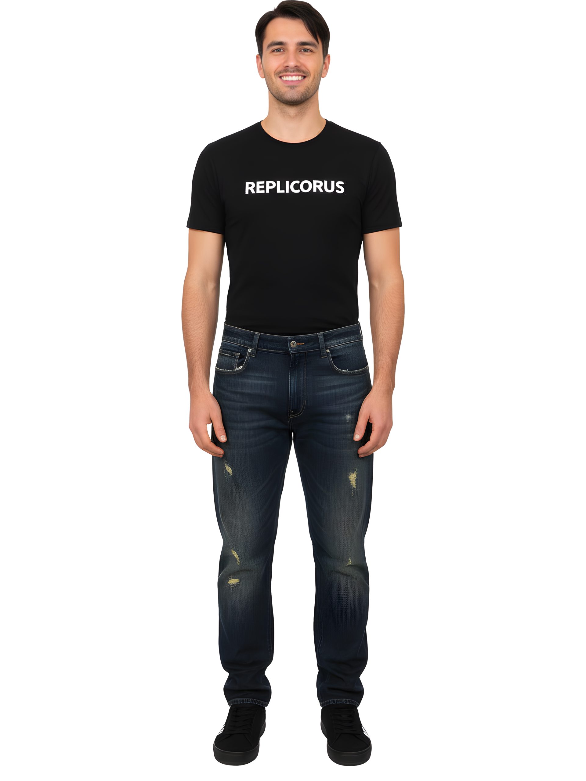 - Distressed detailing across the front and back, including frayed patches, abrasion marks, and worn effects