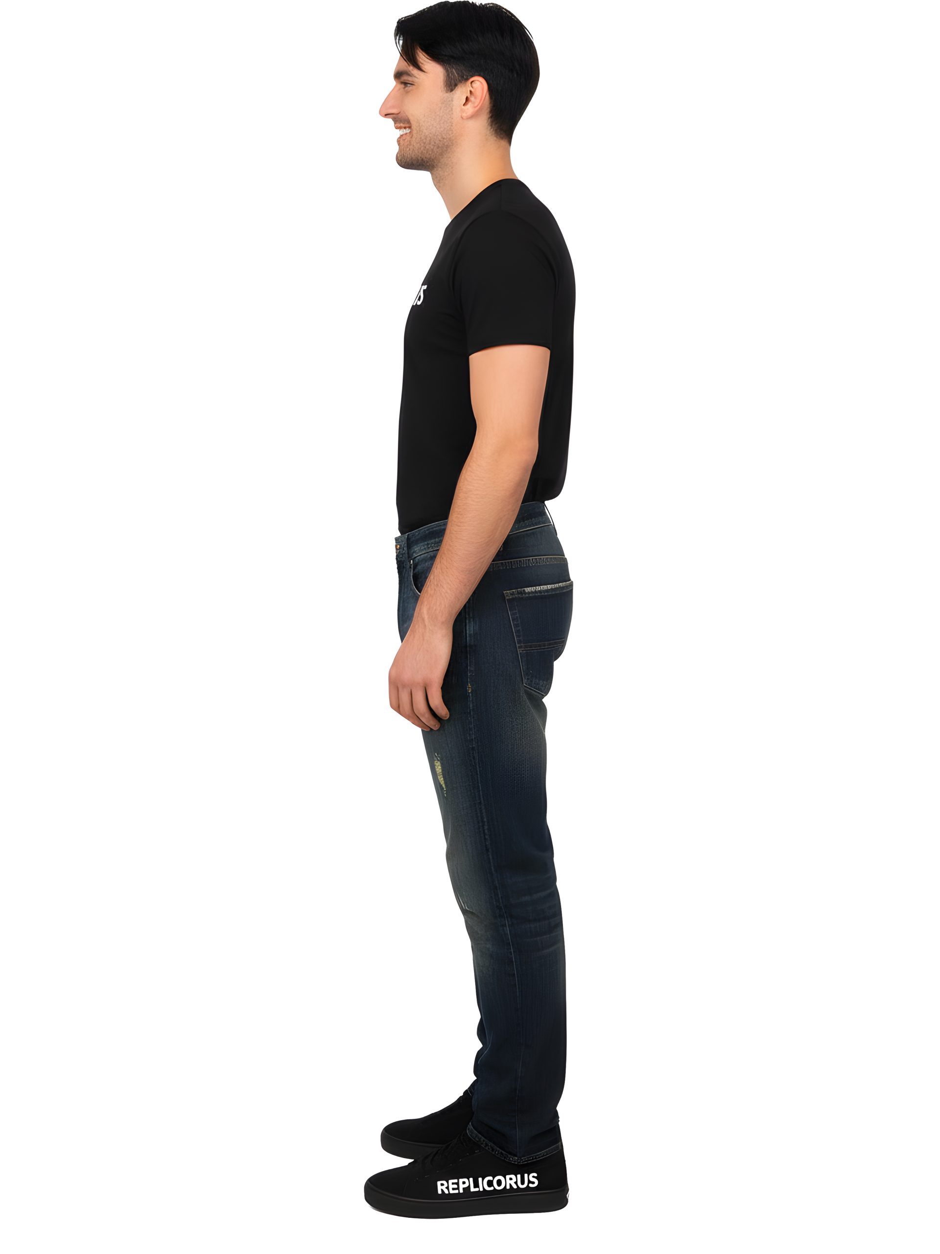- Dark vintage-wash denim with strong fading and whiskering for an authentic lived-in look