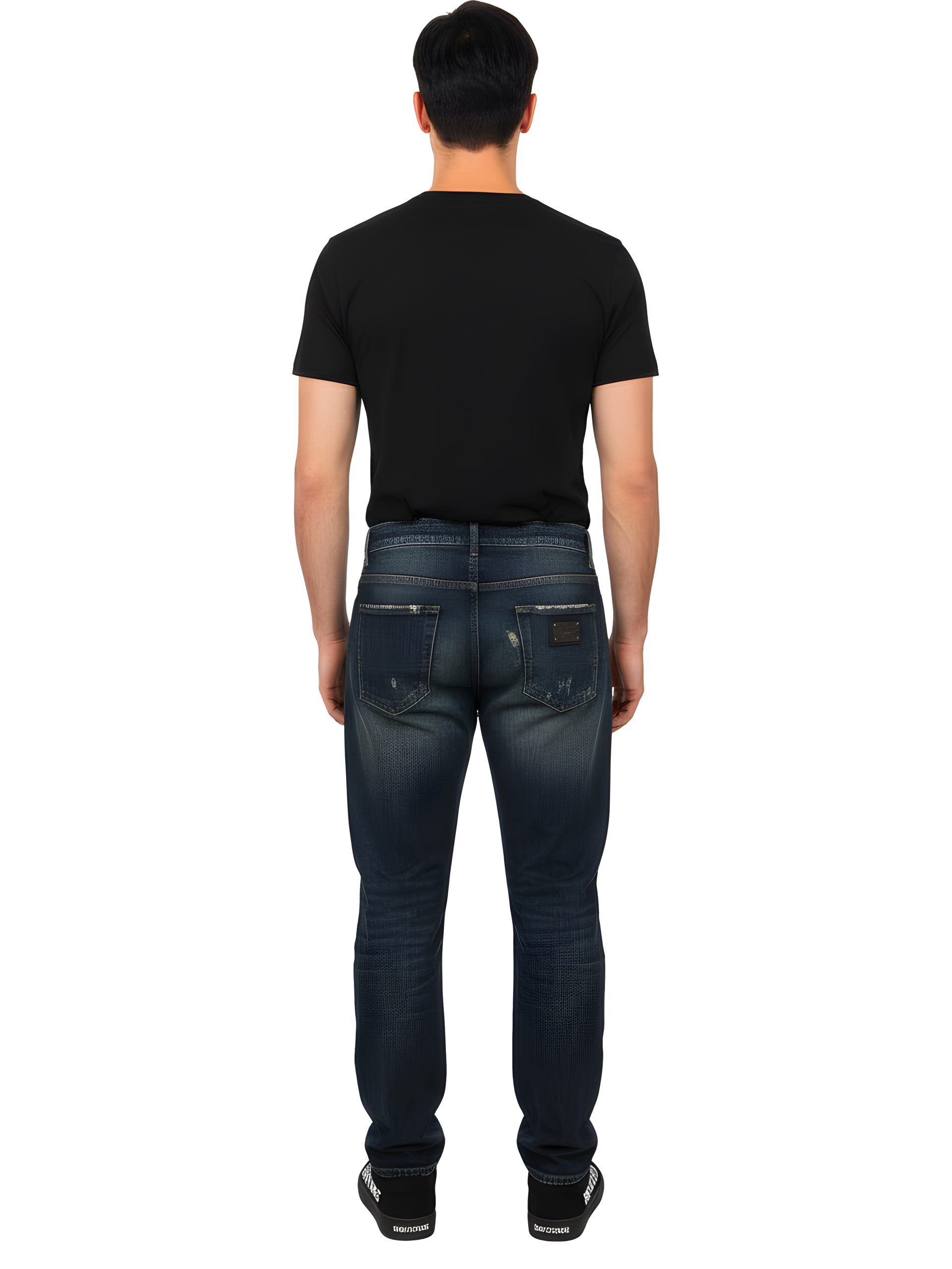 Relaxed and rugged, these Dolce & Gabbana dark vintage-wash loose jeans combine effortless comfort with bold distressed character. The deep blue tone, worn textures, and signature metal plaque highlight a blend of everyday ease and refined Italian craftsmanship. They feature: