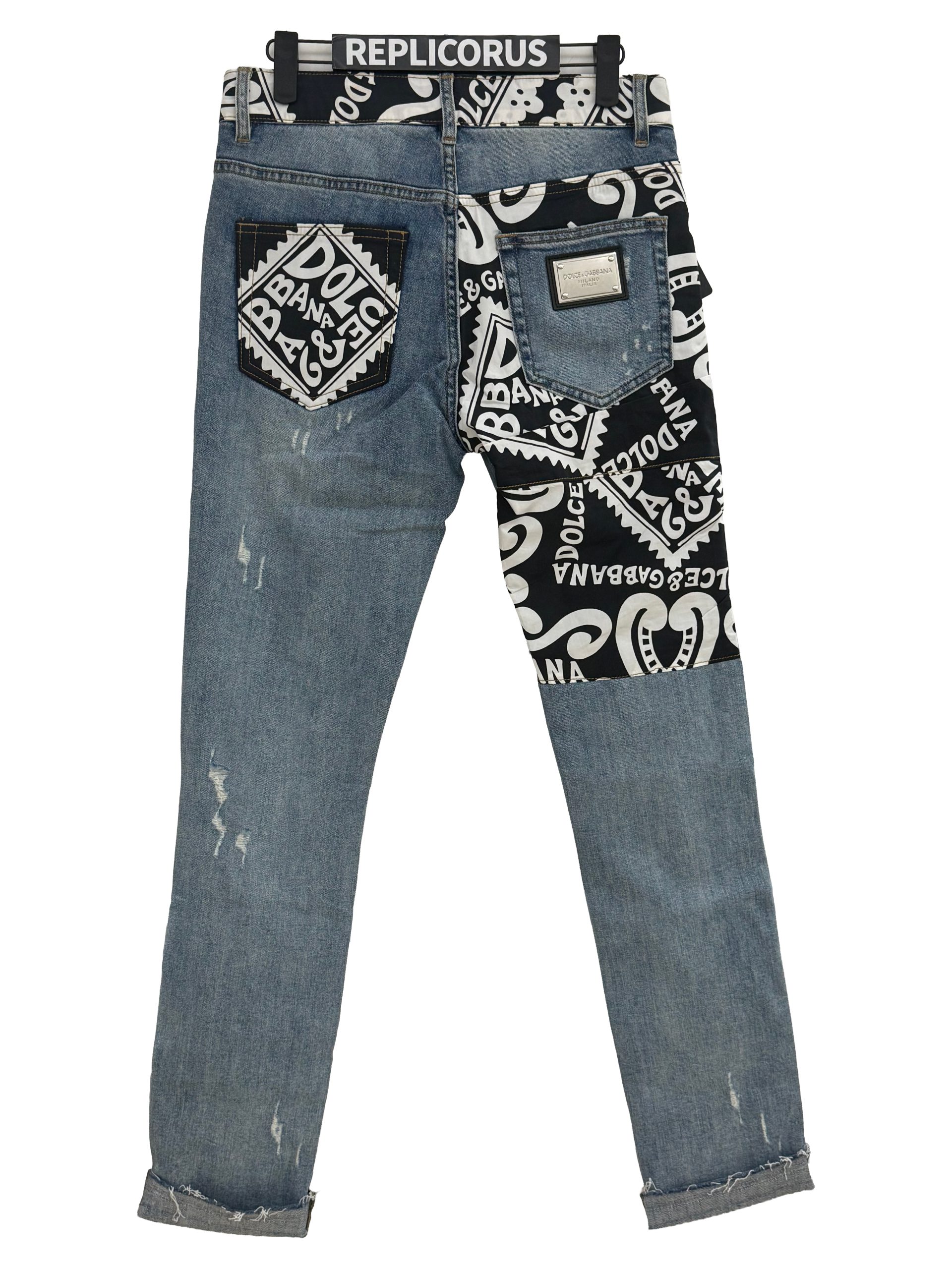 - Black and white Dolce & Gabbana logo patchwork along the waistband, pocket panels, sides, and back for a striking graphic aesthetic