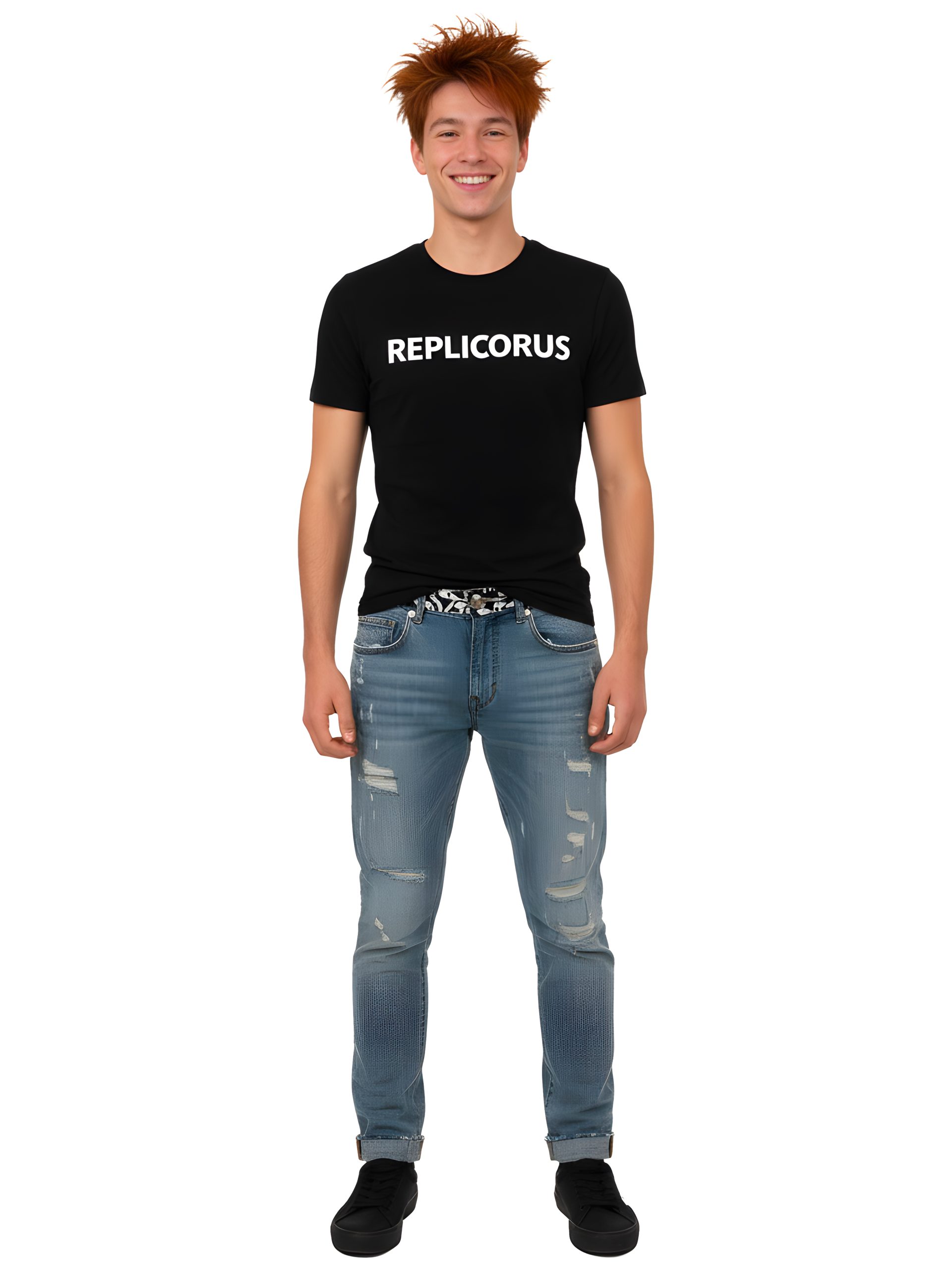 - Heavy distressed detailing across the front and back, including frayed tears and abrasion marks