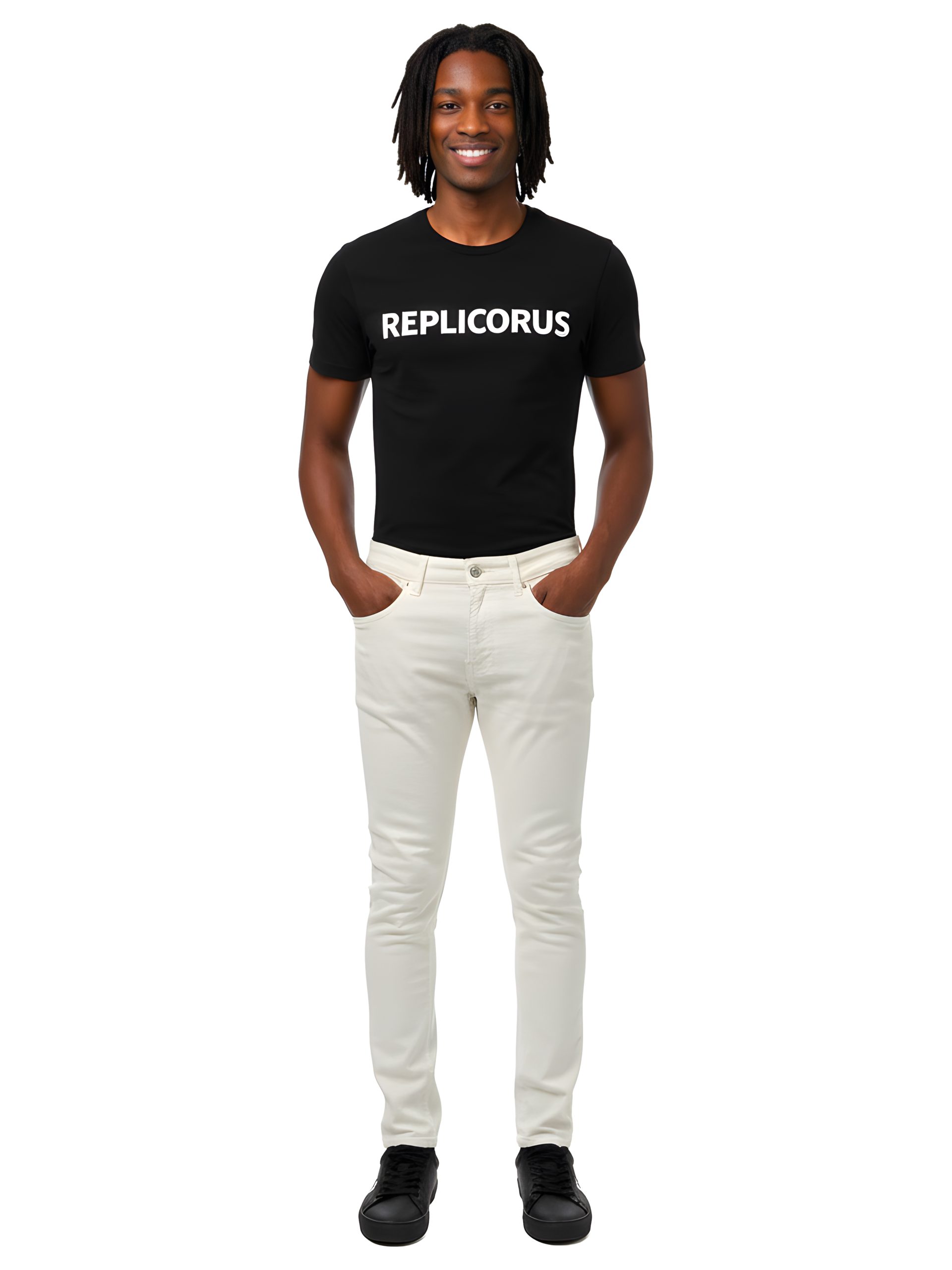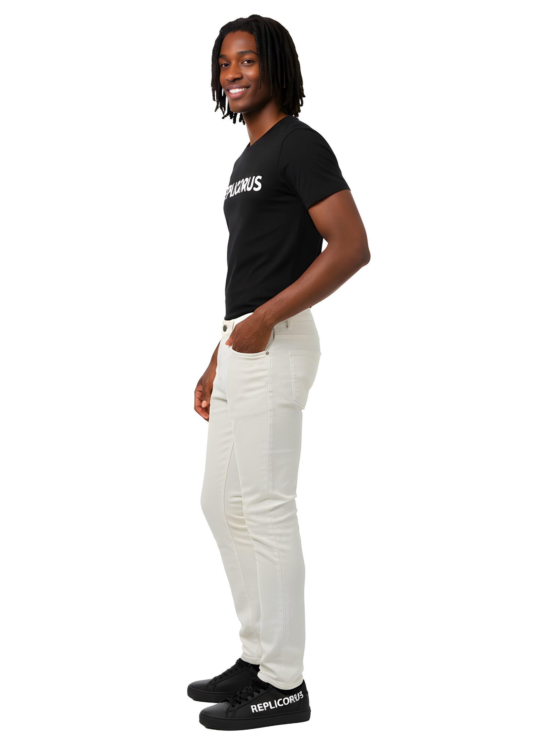 - Pure white denim with a smooth, even finish for a clean and polished aesthetic