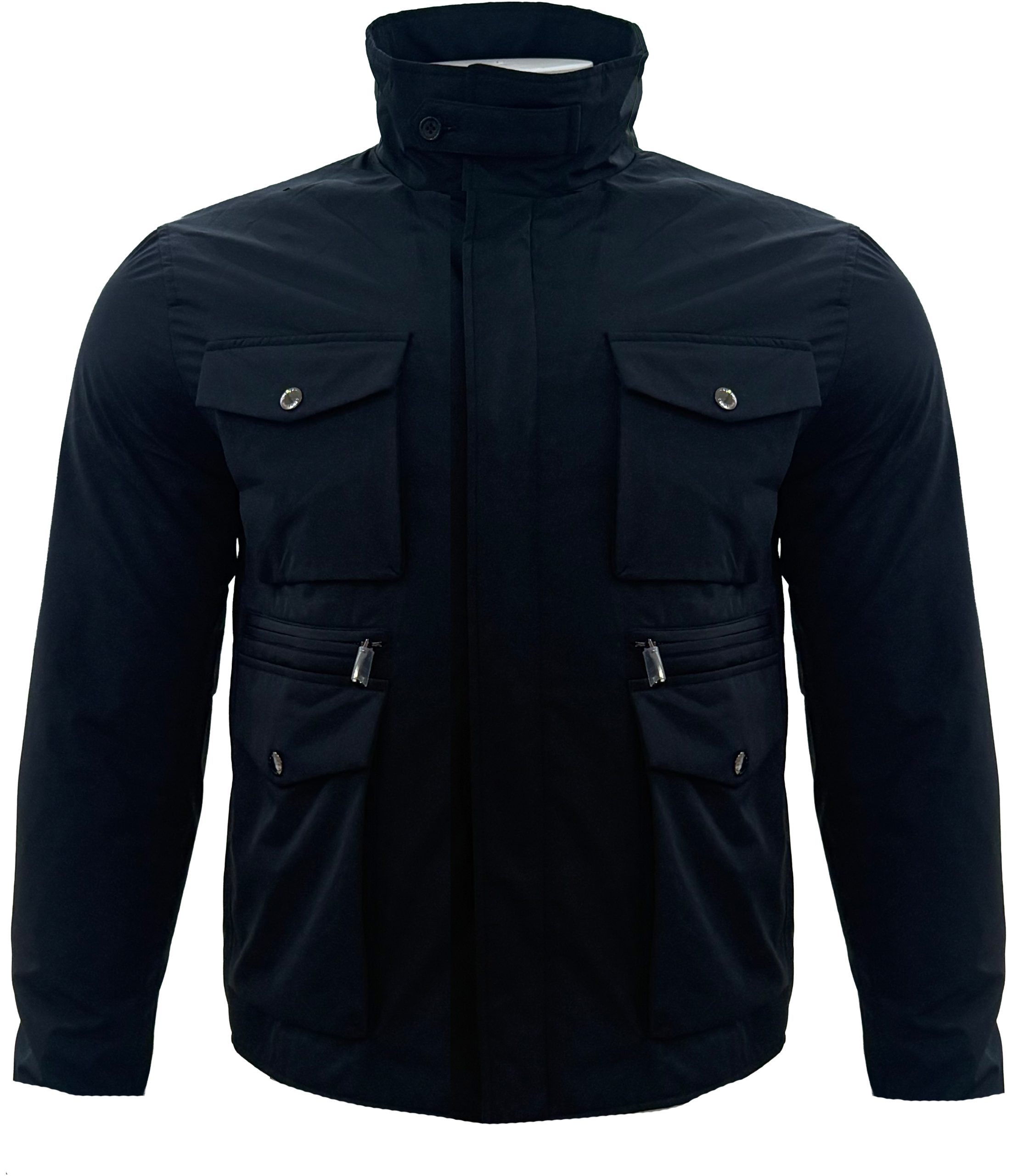 - Four front flap pockets (two on the chest, two at the hips) providing balanced proportions and practical storage