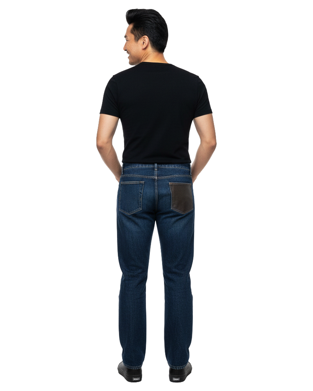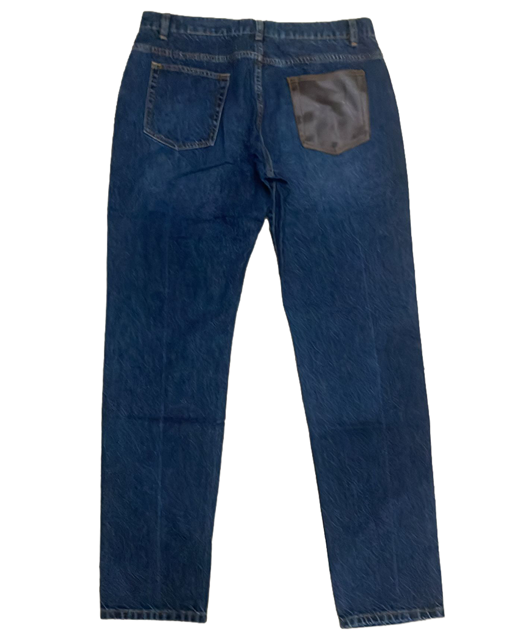 • Full brown leather right back pocket creating a warm and elegant contrast