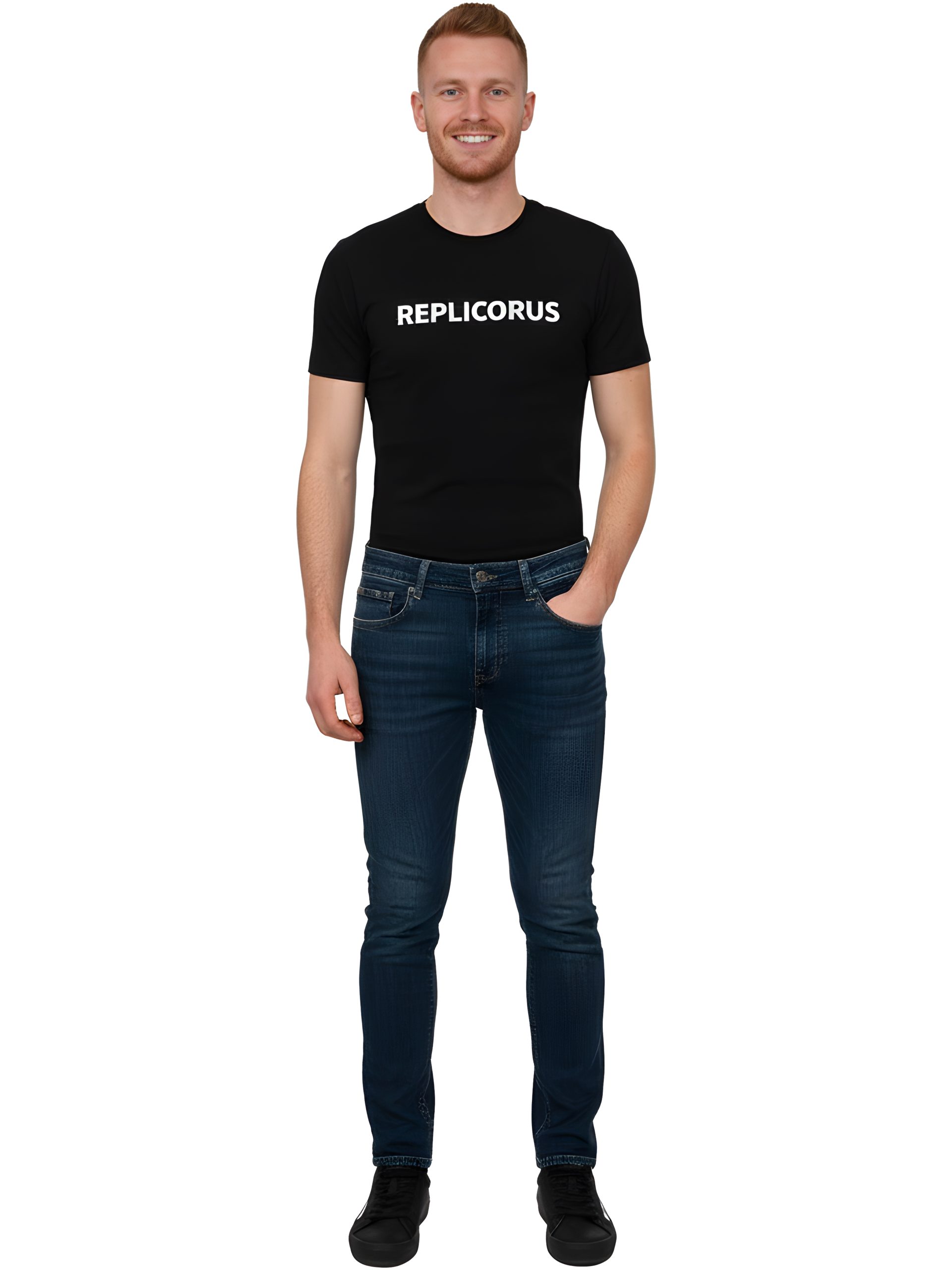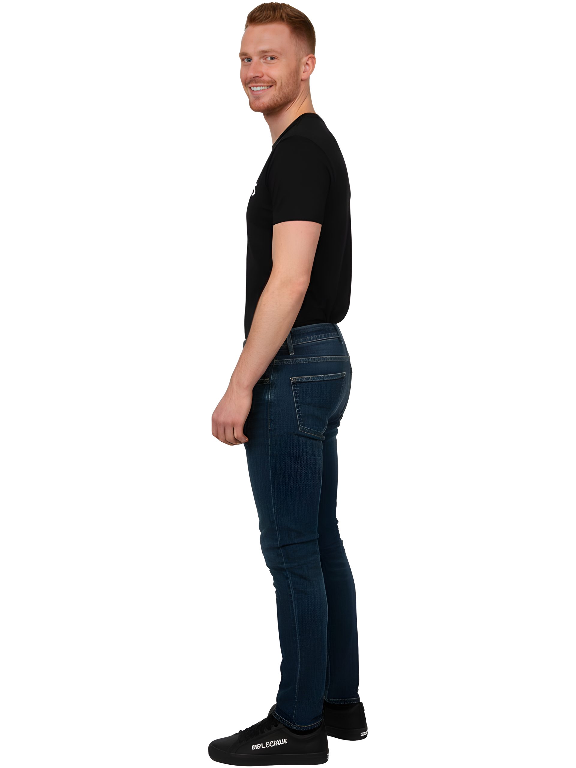 - Dark blue vintage-wash denim with subtle fading for a clean, premium look