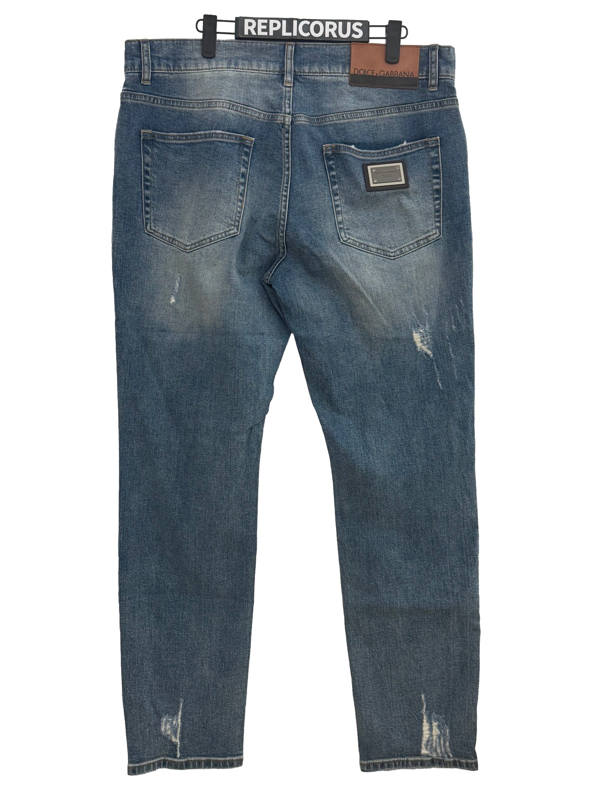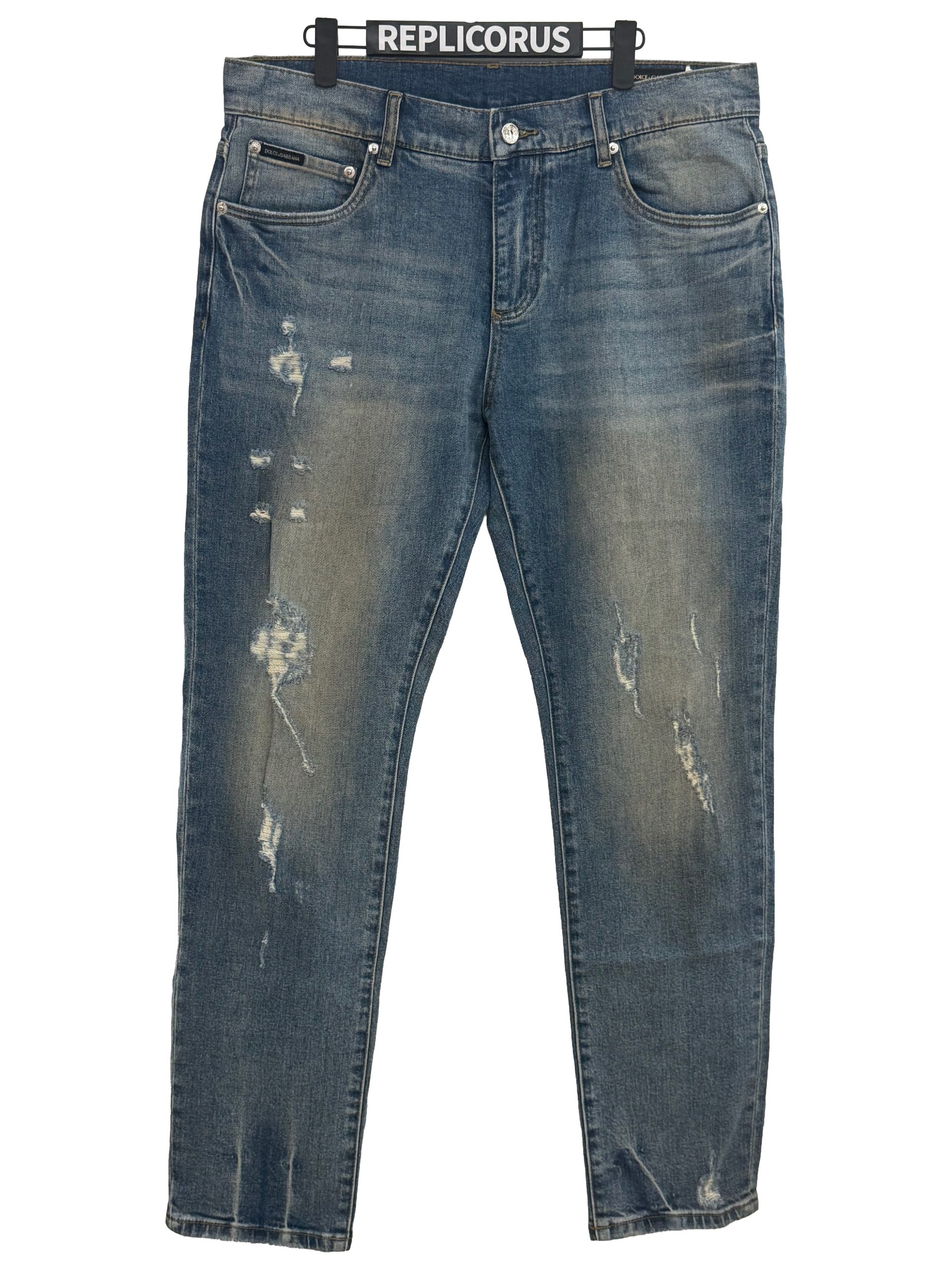 Effortlessly stylish, these Dolce & Gabbana light vintage-wash distressed slim jeans combine a soft, faded finish with rugged detailing for a balanced modern look. The light whiskering, worn patches, and structured slim silhouette create a refined yet relaxed denim essential crafted with Italian expertise. They feature: