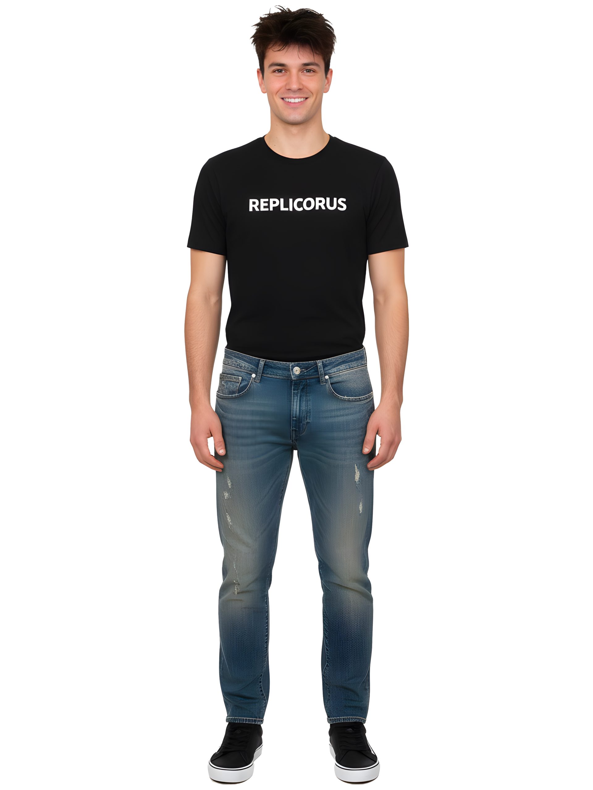 - Distressed detailing across the front and back, including frayed patches, abrasion marks, and worn textures