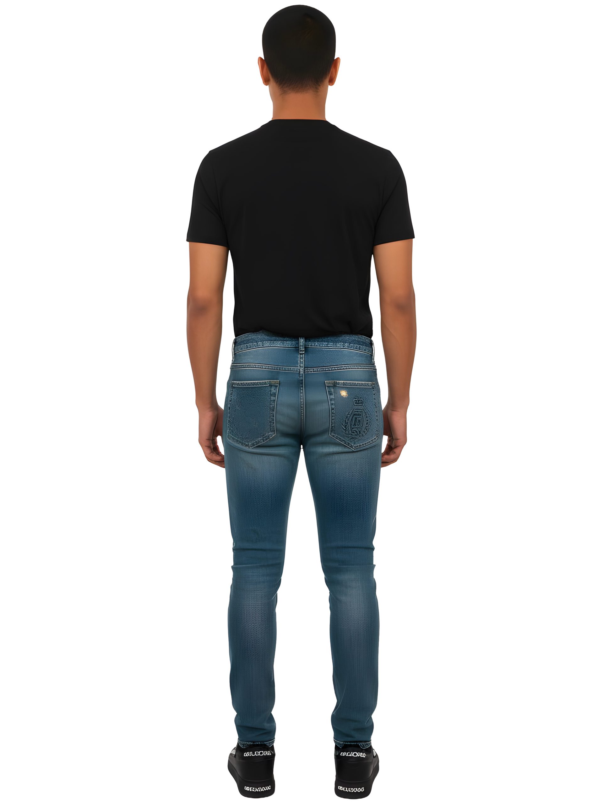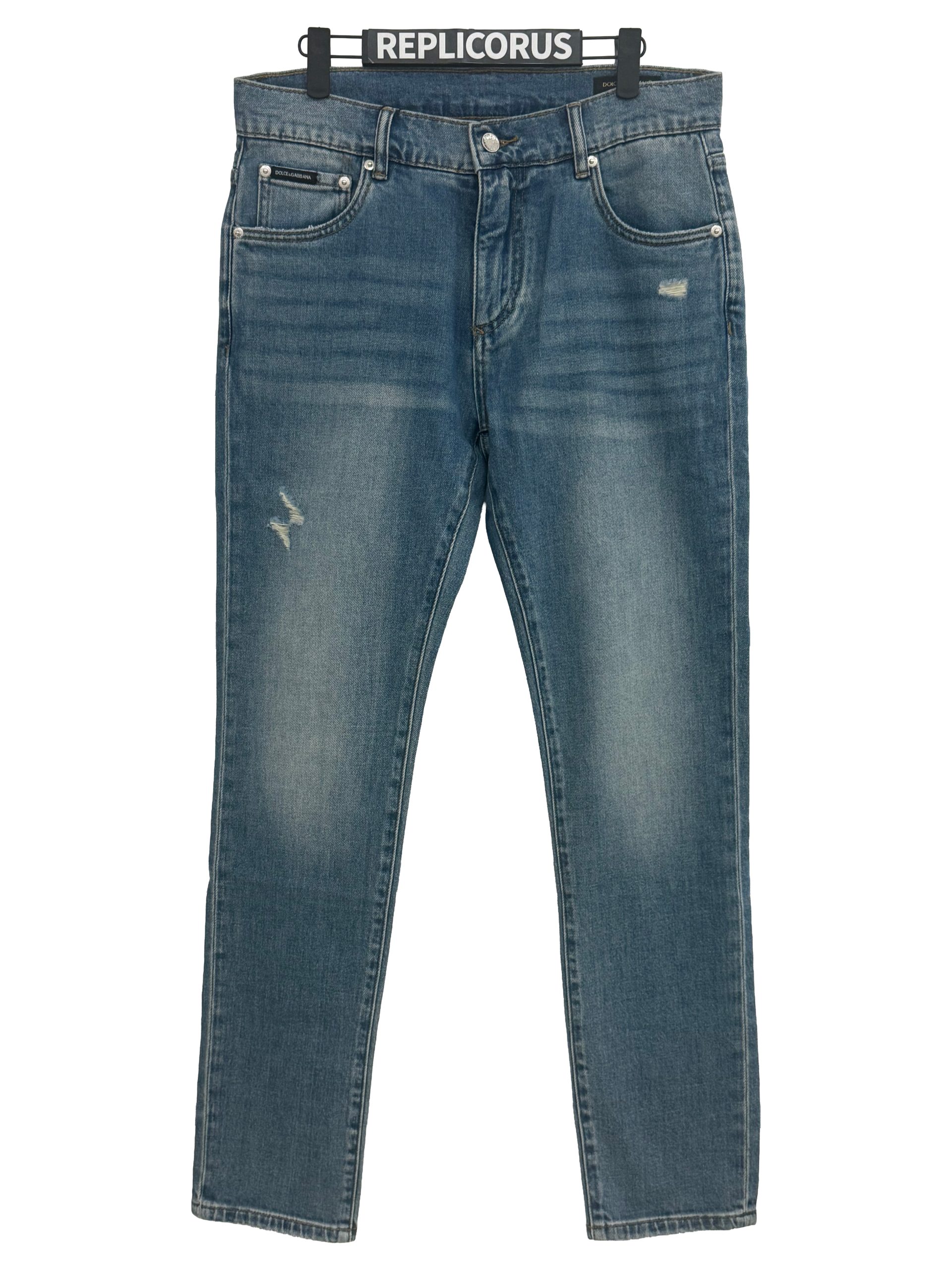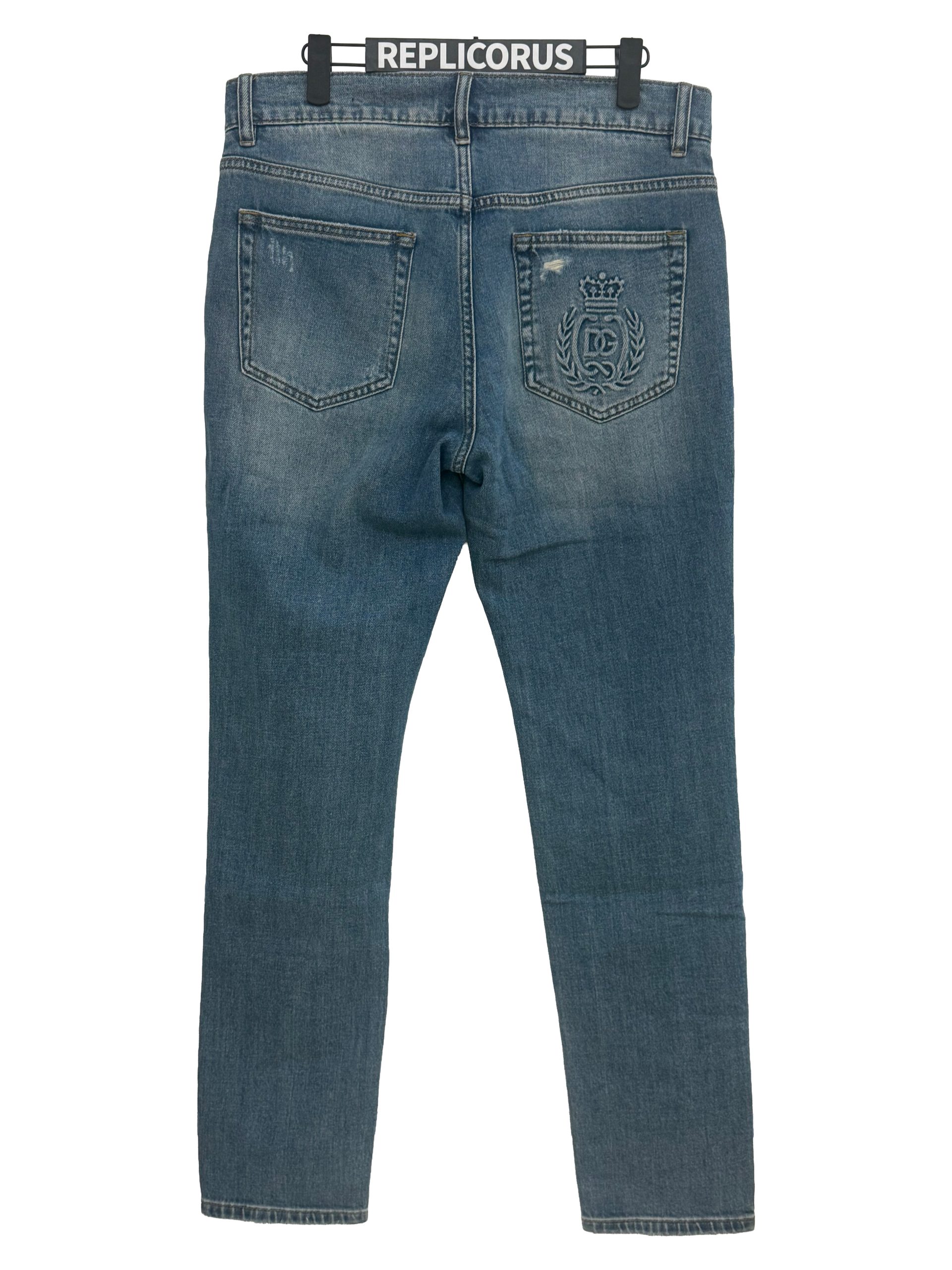 Modern and distinctive, these Dolce & Gabbana light blue slim jeans feature a clean vintage wash enhanced with subtle distressed accents and an embroidered DG crest on the back pocket. The balanced fading, tailored silhouette, and signature detailing create a refined everyday denim piece. They feature: