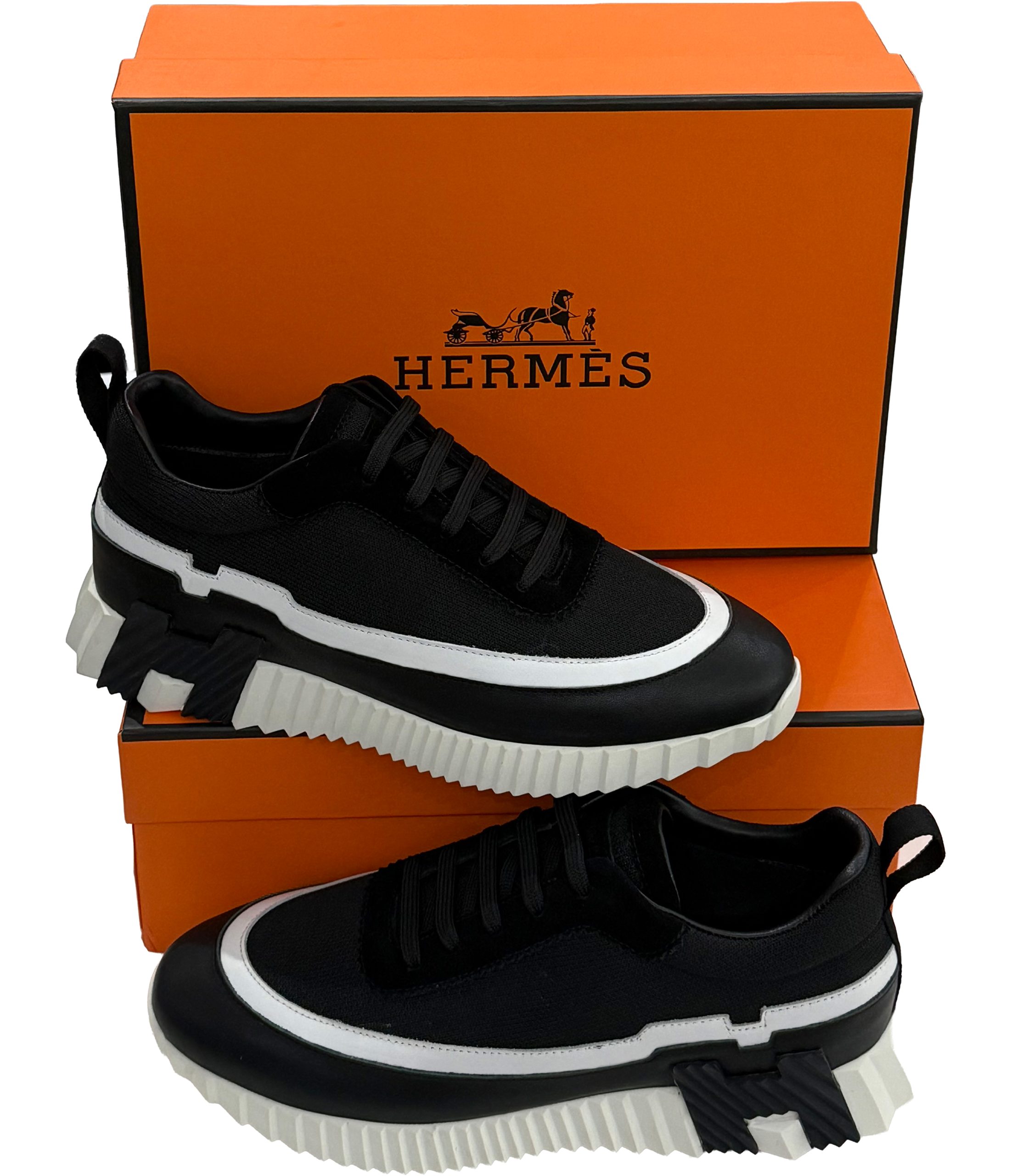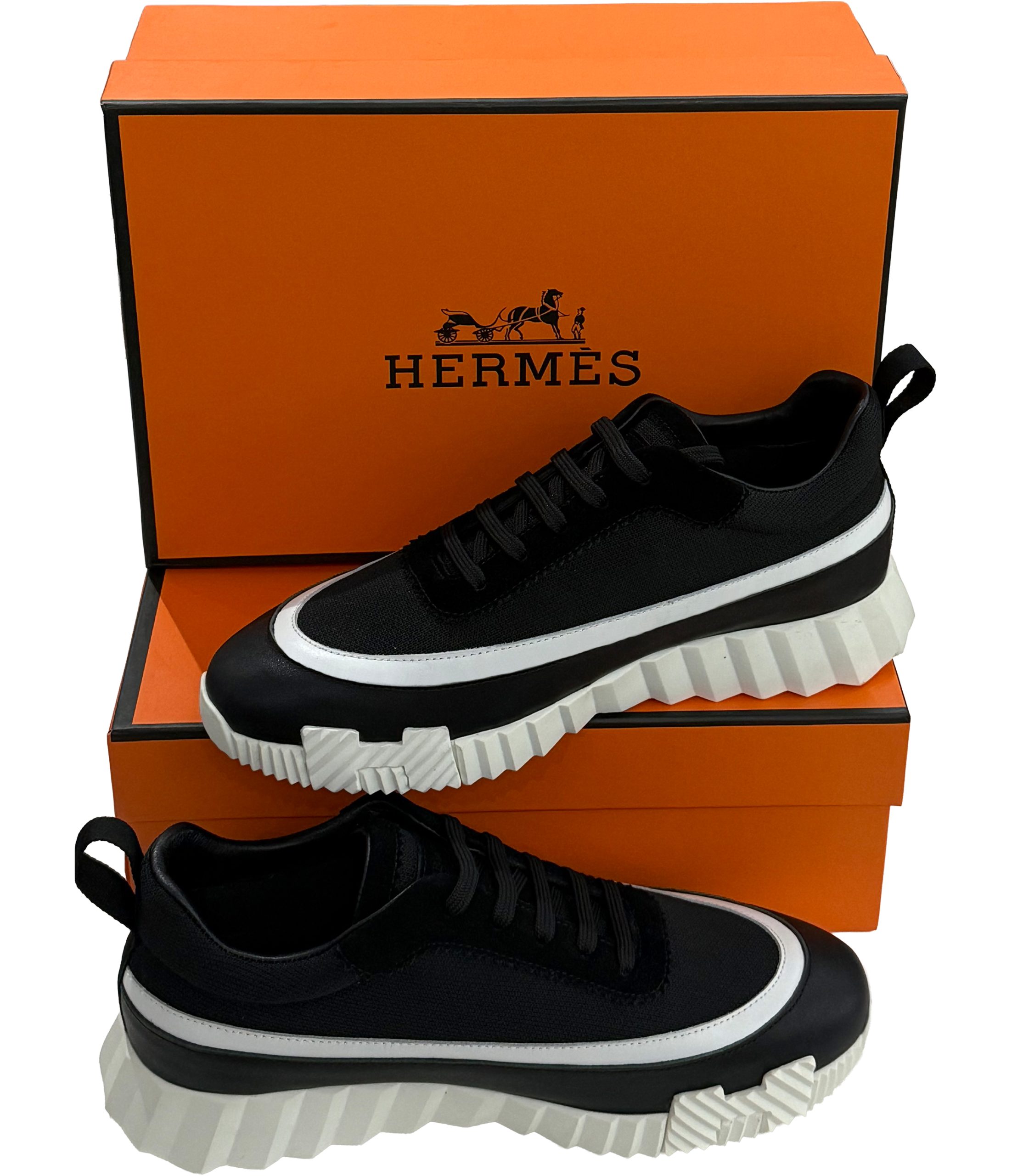 This Hermès black and white low-top sneaker combines a sleek upper with a bold, sculptural sole for a modern luxury streetwear look. The contrast between the black technical materials and the crisp white detailing creates a sharp, graphic profile that works perfectly for everyday wear, travel, or elevated casual outfits.